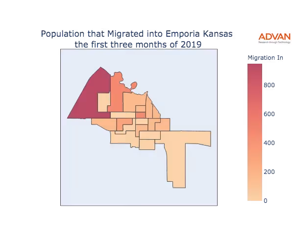 The map below shows the migration into Emporia, KS by Census Block Group (CBG).