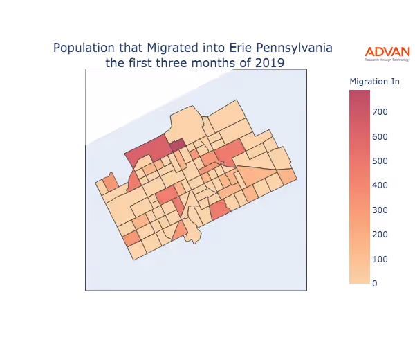 The map below shows the migration into Erie, PA by Census Block Group (CBG).