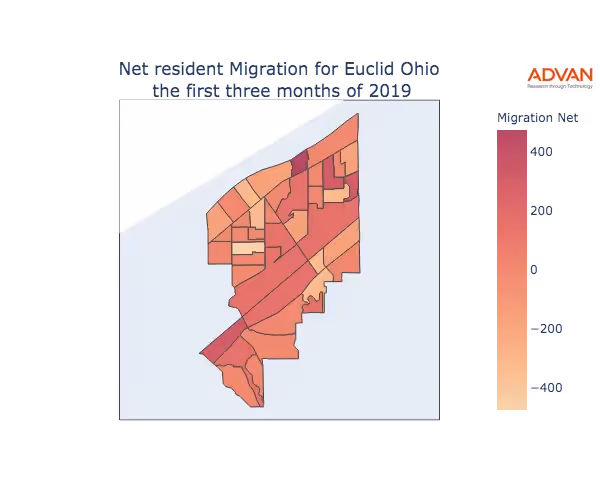 The map below shows the migration into Euclid, OH by Census Block Group (CBG).