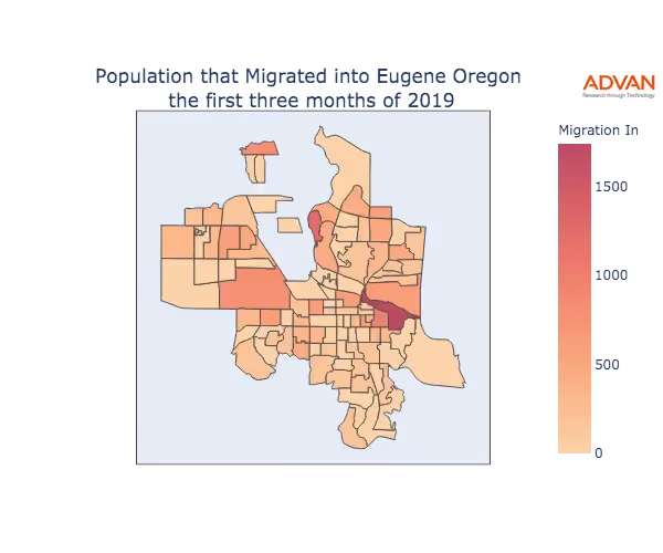The map below shows the migration into Eugene, OR by Census Block Group (CBG).
