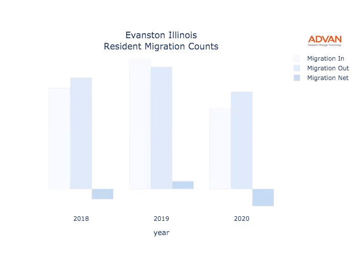 The charts below graph the inbound, outbound and net migration to the city of Evanston, IL for each year of data available. Data displayed on the charts is annually aggregated; the REPerspectives product allows analysis of mobility trends with monthly granularity by State, Zip, County and Census Block Group.
