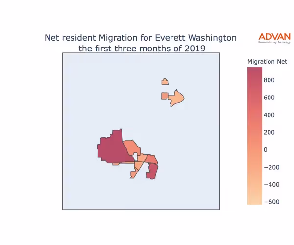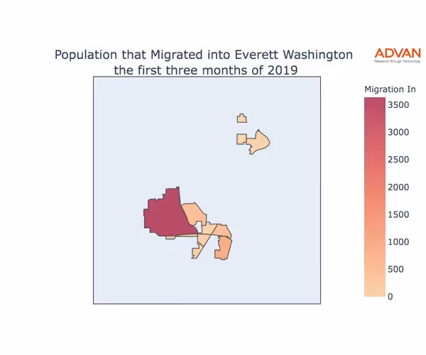 The map below shows the migration into Everett, WA by Census Block Group (CBG).