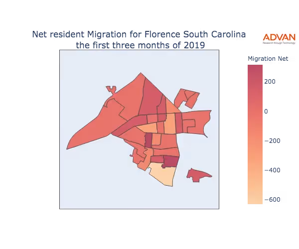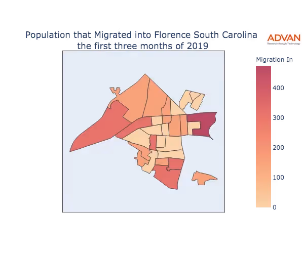 The map below shows the migration into Florence, SC by Census Block Group (CBG).