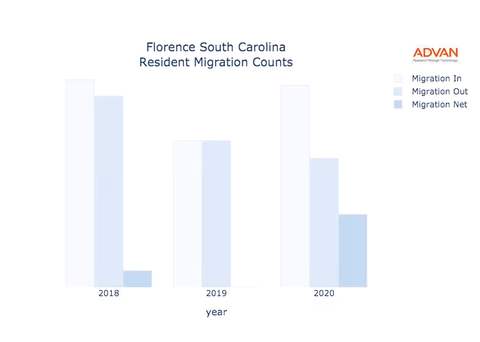 The charts below graph the inbound, outbound and net migration to the city of Florence, SC for each year of data available. Data displayed on the charts is annually aggregated; the REPerspectives product allows analysis of mobility trends with monthly granularity by State, Zip, County and Census Block Group.