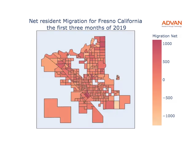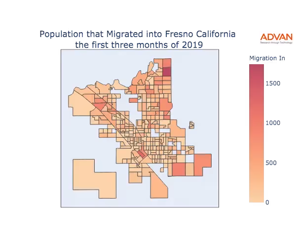 The map below shows the migration into Fresno, CA by Census Block Group (CBG).