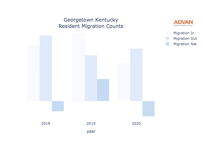 The charts below graph the inbound, outbound and net migration to the city of Georgetown, KY for each year of data available. Data displayed on the charts is annually aggregated; the REPerspectives product allows analysis of mobility trends with monthly granularity by State, Zip, County and Census Block Group.