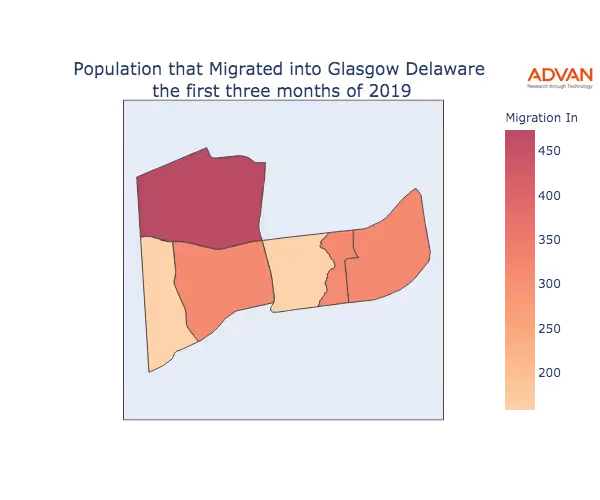 The map below shows the migration into Glasgow, DE by Census Block Group (CBG).