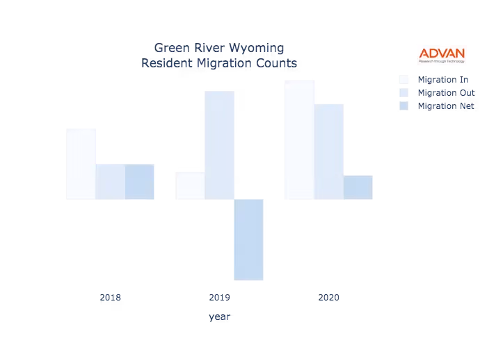 The charts below graph the inbound, outbound and net migration to the city of Green River, WY for each year of data available. Data displayed on the charts is annually aggregated; the REPerspectives product allows analysis of mobility trends with monthly granularity by State, Zip, County and Census Block Group.