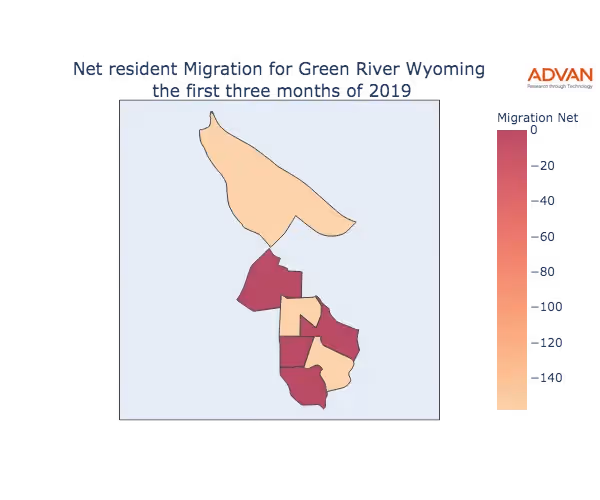 The map below shows the migration into Green River, WY by Census Block Group (CBG).