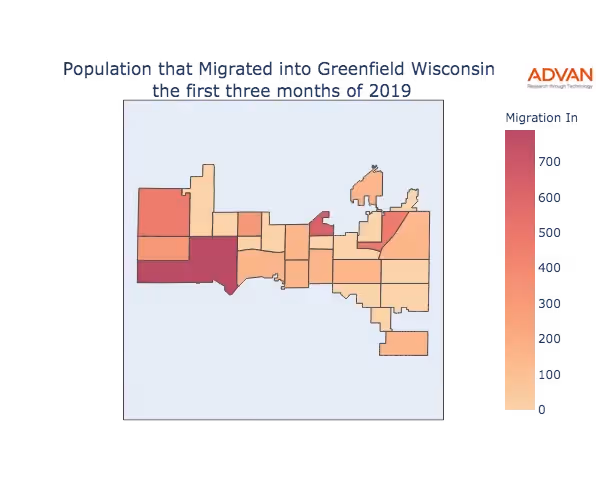 The map below shows the migration into Greenfield, WI by Census Block Group (CBG).