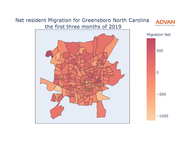 The map below shows the migration into Greensboro, NC by Census Block Group (CBG).