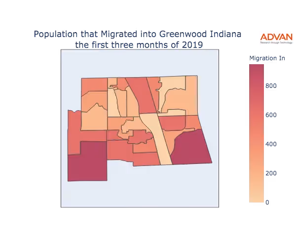 The map below shows the migration into Greenwood, IN by Census Block Group (CBG).