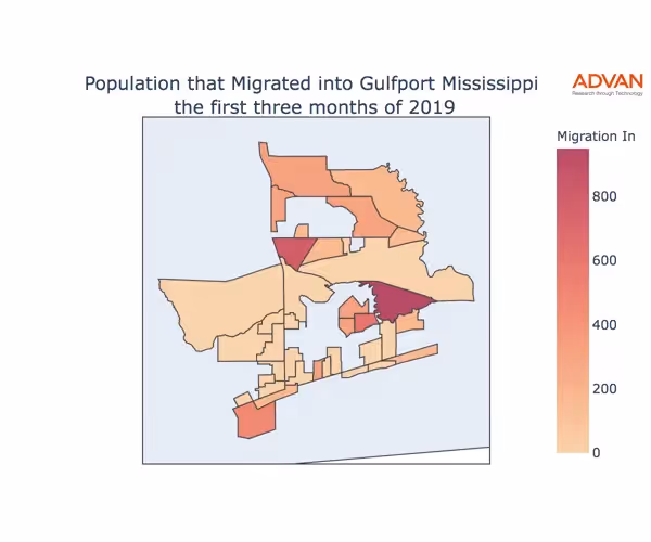 The map below shows the migration into Gulfport, MS by Census Block Group (CBG).