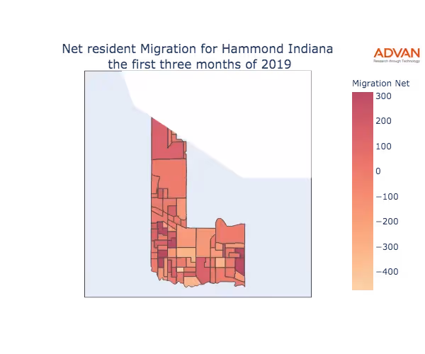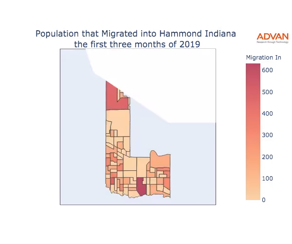 The map below shows the migration into Hammond, IN by Census Block Group (CBG).