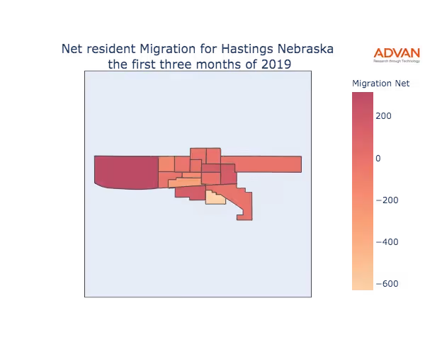 The map below shows the migration into Hastings, NE by Census Block Group (CBG).