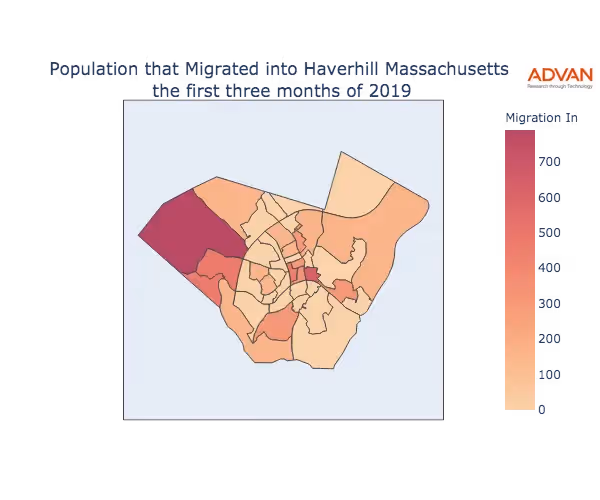 The map below shows the migration into Haverhill, MA by Census Block Group (CBG).