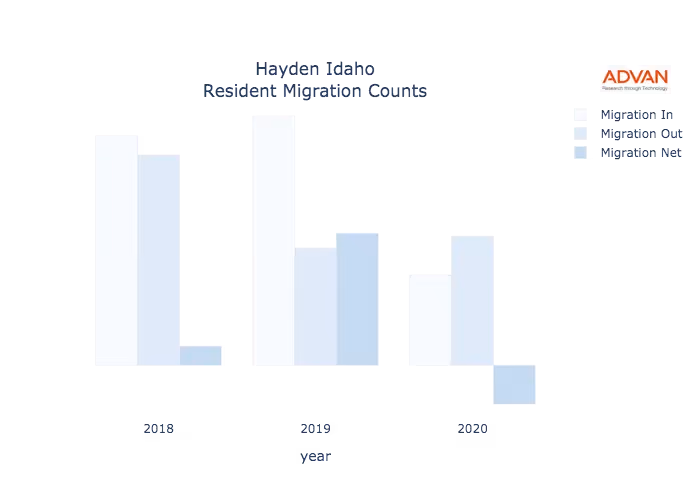 The charts below graph the inbound, outbound and net migration to the city of Hayden, ID for each year of data available. Data displayed on the charts is annually aggregated; the REPerspectives product allows analysis of mobility trends with monthly granularity by State, Zip, County and Census Block Group.