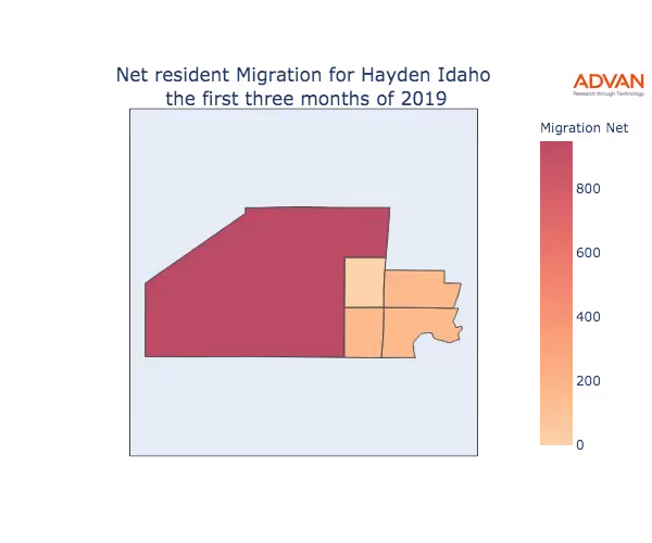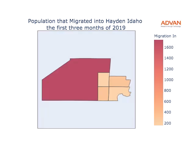 The map below shows the migration into Hayden, ID by Census Block Group (CBG).