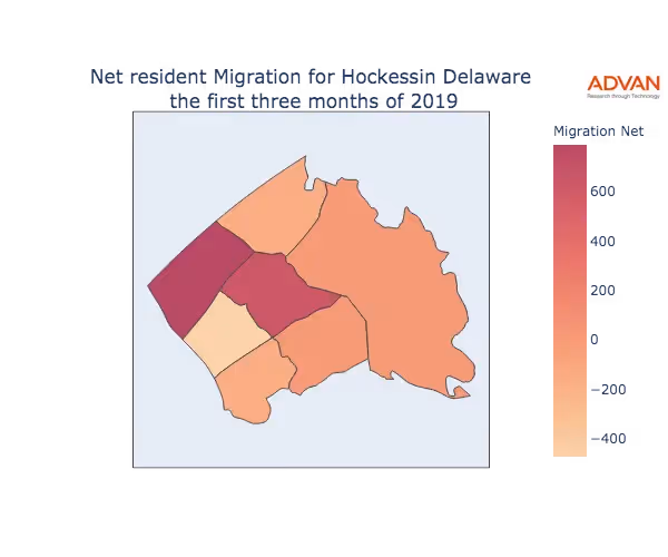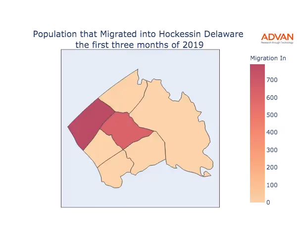 The map below shows the migration into Hockessin, DE by Census Block Group (CBG).