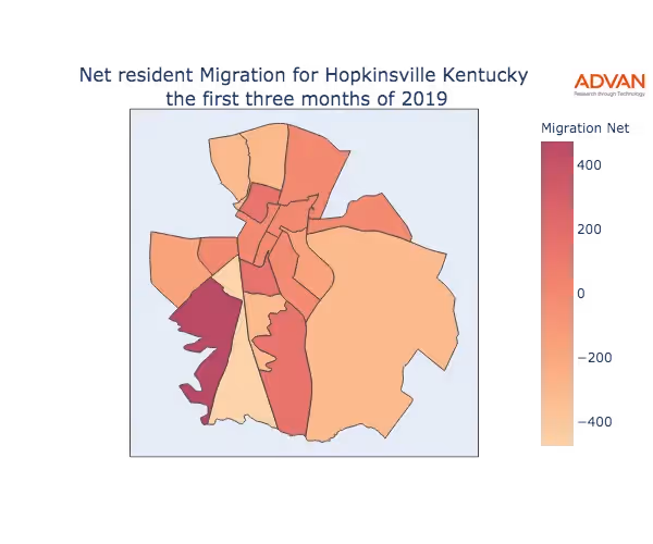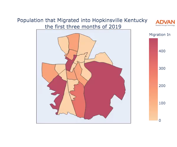 The map below shows the migration into Hopkinsville, KY by Census Block Group (CBG).