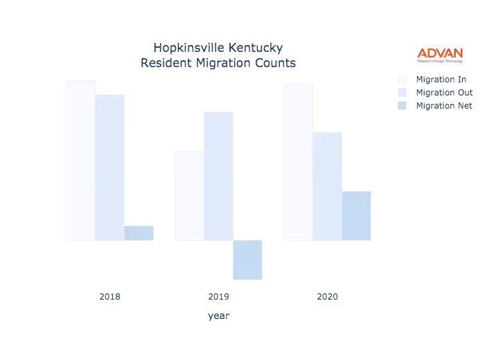The charts below graph the inbound, outbound and net migration to the city of Hopkinsville, KY for each year of data available. Data displayed on the charts is annually aggregated; the REPerspectives product allows analysis of mobility trends with monthly granularity by State, Zip, County and Census Block Group.