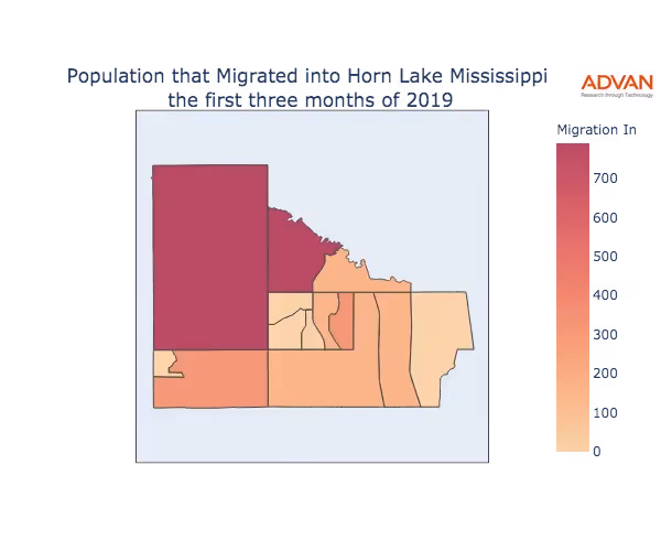 The map below shows the migration into Horn Lake, MS by Census Block Group (CBG).
