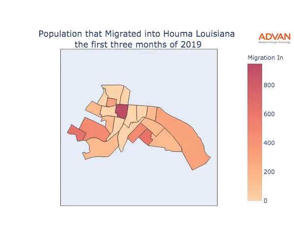 The map below shows the migration into Houma, LA by Census Block Group (CBG).