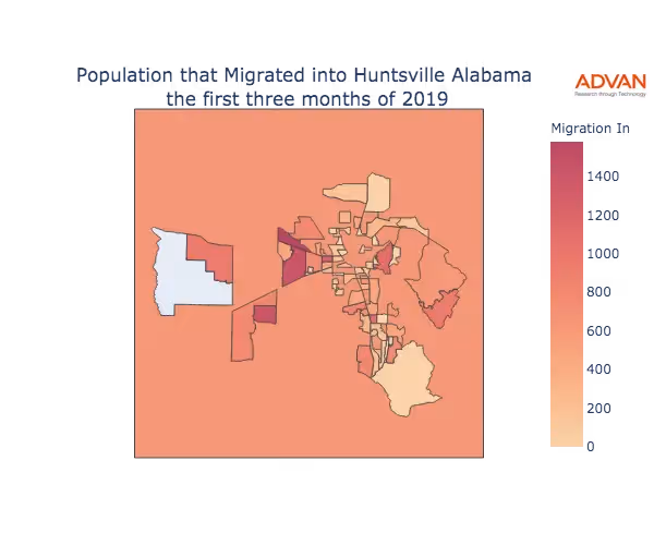 The map below shows the migration into Huntsville, AL by Census Block Group (CBG).