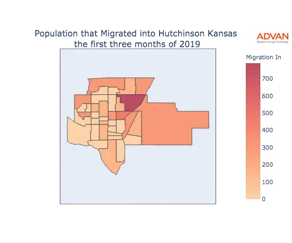 The map below shows the migration into Hutchinson, KS by Census Block Group (CBG).