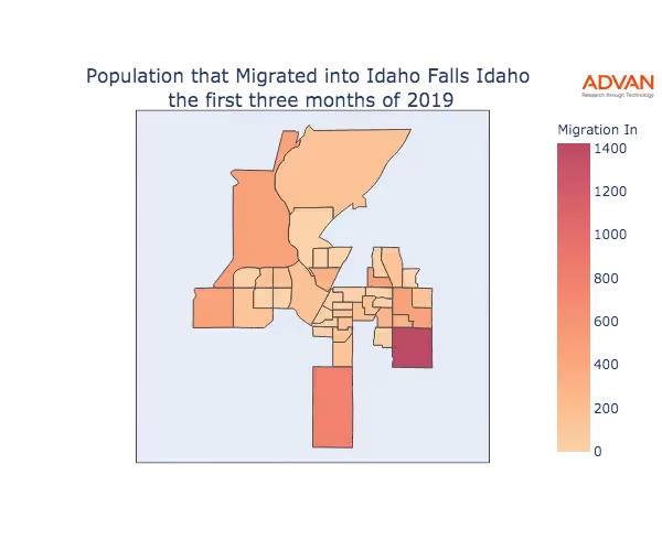 The map below shows the migration into Idaho Falls, ID by Census Block Group (CBG).