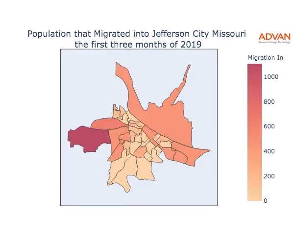 The map below shows the migration into Jefferson City, MO by Census Block Group (CBG).