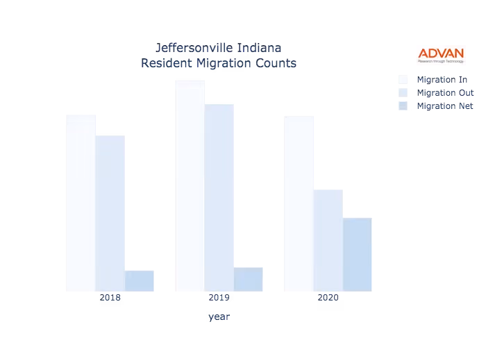 The charts below graph the inbound, outbound and net migration to the city of Jeffersonville, IN for each year of data available. Data displayed on the charts is annually aggregated; the REPerspectives product allows analysis of mobility trends with monthly granularity by State, Zip, County and Census Block Group.