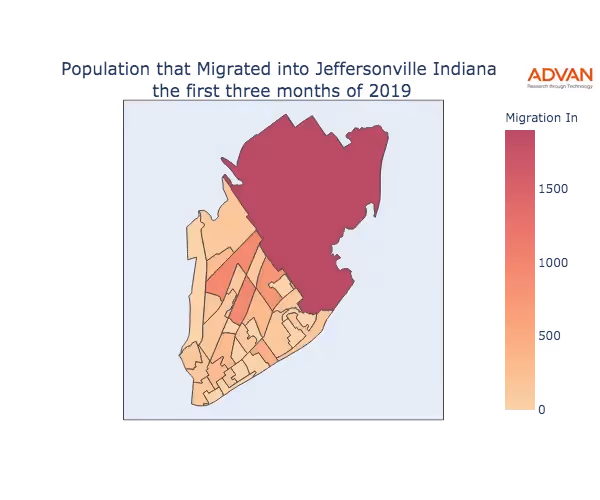The map below shows the migration into Jeffersonville, IN by Census Block Group (CBG).
