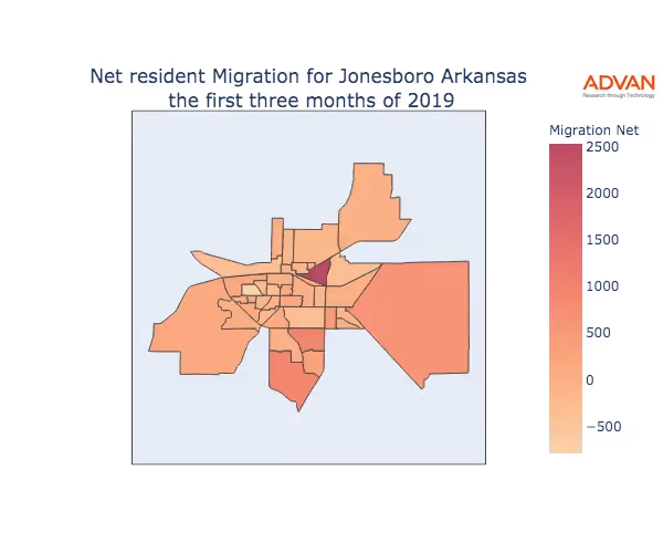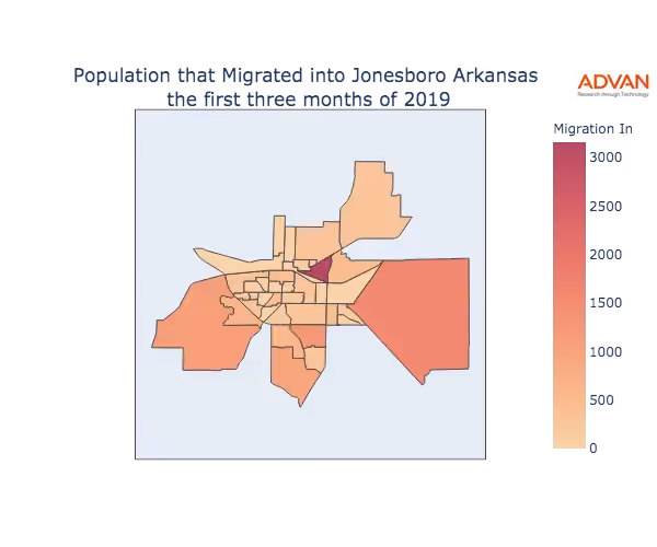 The map below shows the migration into Jonesboro, AR by Census Block Group (CBG).