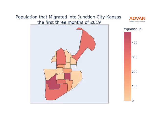 The map below shows the migration into Junction City, KS by Census Block Group (CBG).