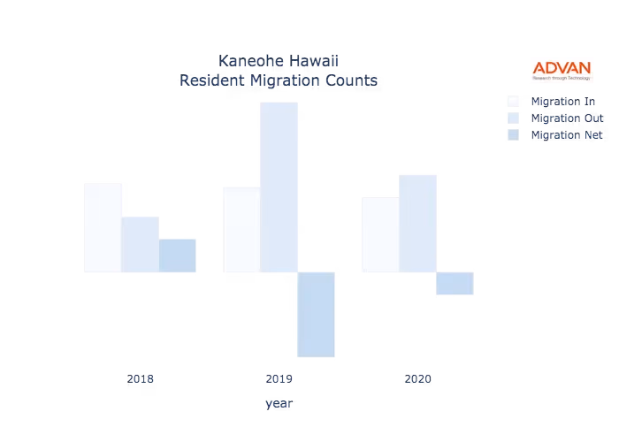The charts below graph the inbound, outbound and net migration to the city of Kaneohe, HI for each year of data available. Data displayed on the charts is annually aggregated; the REPerspectives product allows analysis of mobility trends with monthly granularity by State, Zip, County and Census Block Group.