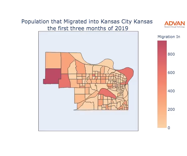 The map below shows the migration into Kansas City, KS by Census Block Group (CBG).