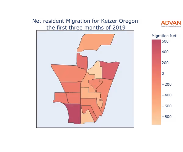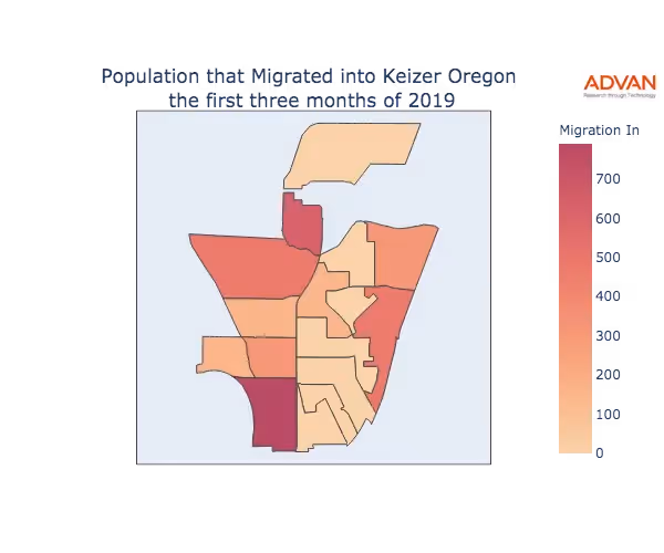 The map below shows the migration into Keizer, OR by Census Block Group (CBG).