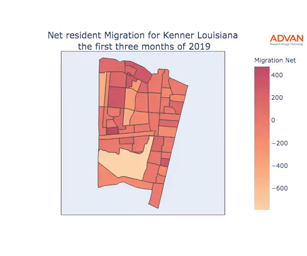 The map below shows the migration into Kenner, LA by Census Block Group (CBG).