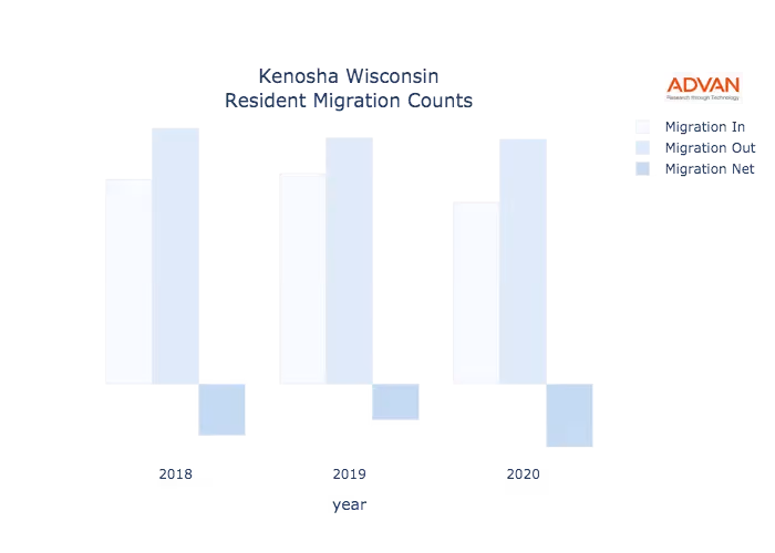 The charts below graph the inbound, outbound and net migration to the city of Kenosha, WI for each year of data available. Data displayed on the charts is annually aggregated; the REPerspectives product allows analysis of mobility trends with monthly granularity by State, Zip, County and Census Block Group.