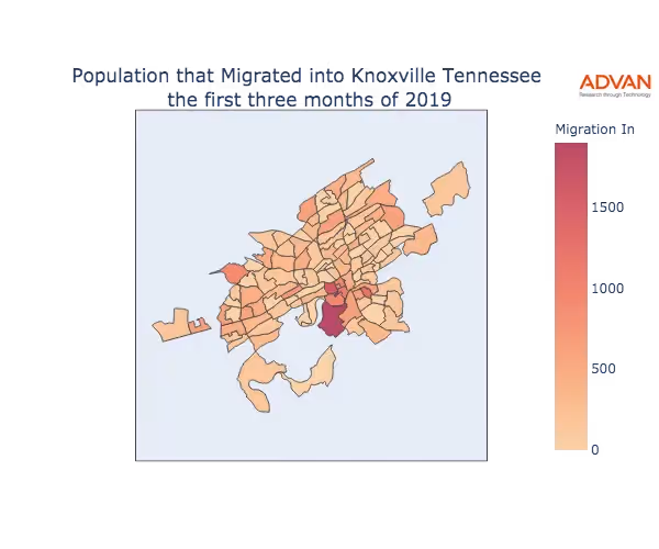 The map below shows the migration into Knoxville, TN by Census Block Group (CBG).