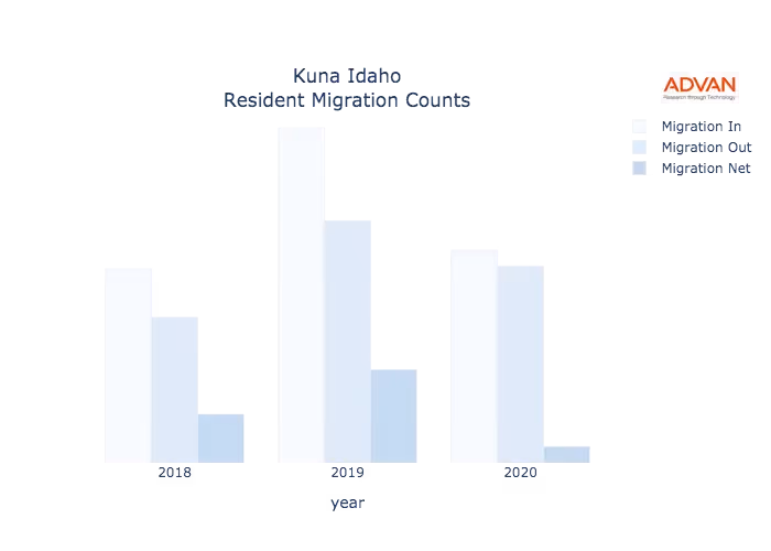 The charts below graph the inbound, outbound and net migration to the city of Kuna, ID for each year of data available. Data displayed on the charts is annually aggregated; the REPerspectives product allows analysis of mobility trends with monthly granularity by State, Zip, County and Census Block Group.