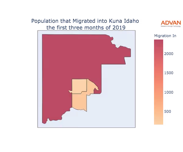 The map below shows the migration into Kuna, ID by Census Block Group (CBG).