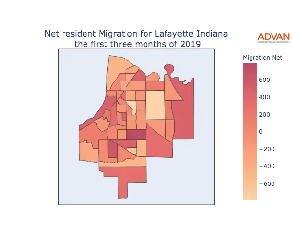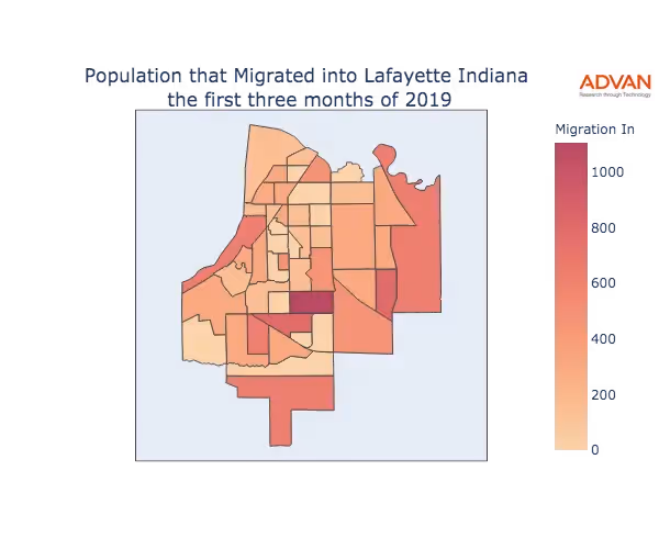 The map below shows the migration into Lafayette, IN by Census Block Group (CBG).