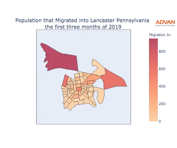 The map below shows the migration into Lancaster, PA by Census Block Group (CBG).