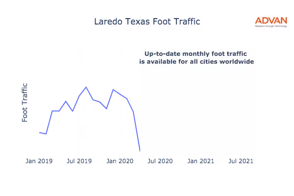 Up-to-date monthly foot traffic is available for all cities worldwide.