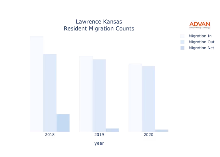 The charts below graph the inbound, outbound and net migration to the city of Lawrence, KS for each year of data available. Data displayed on the charts is annually aggregated; the REPerspectives product allows analysis of mobility trends with monthly granularity by State, Zip, County and Census Block Group.