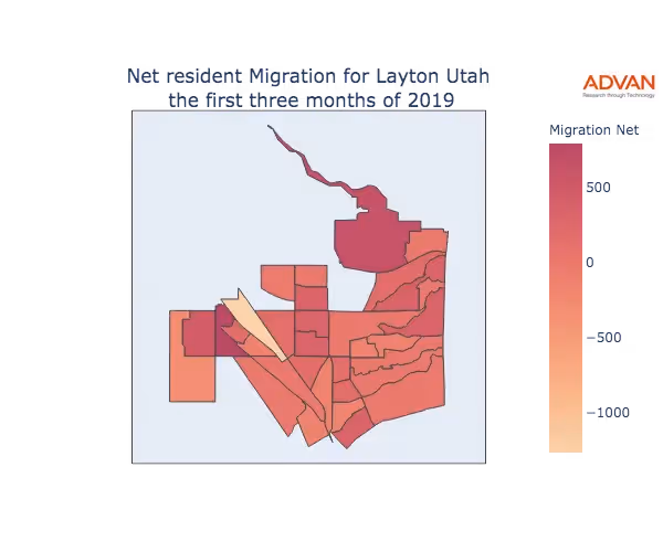 The map below shows the migration into Layton, UT by Census Block Group (CBG).