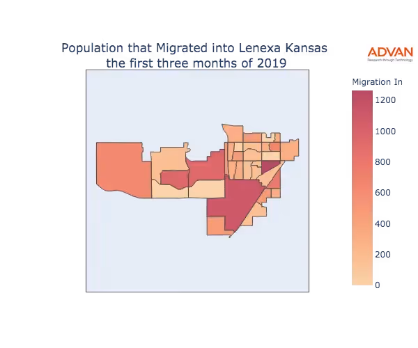 The map below shows the migration into Lenexa, KS by Census Block Group (CBG).