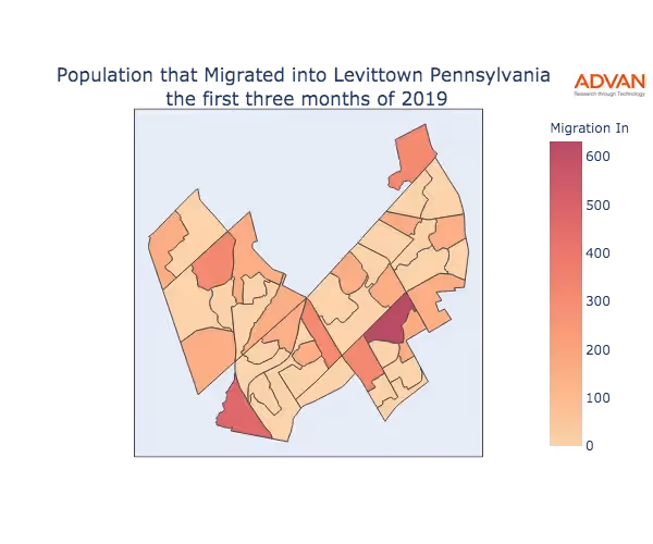 The map below shows the migration into Levittown, PA by Census Block Group (CBG).